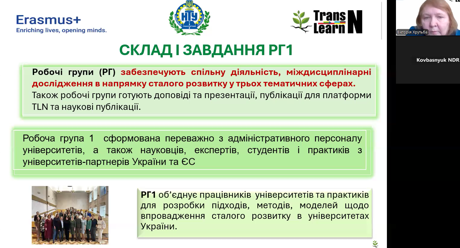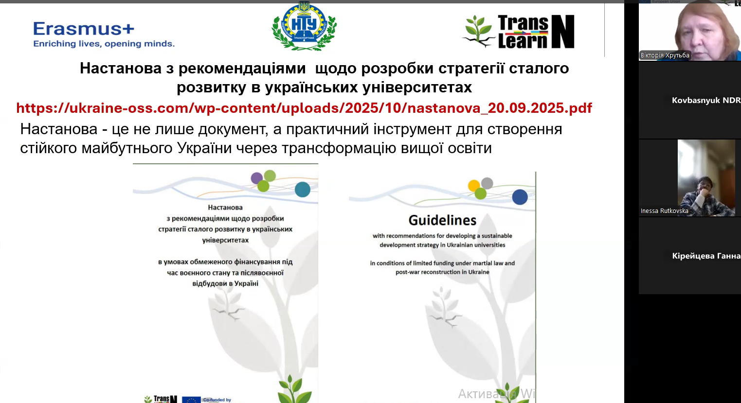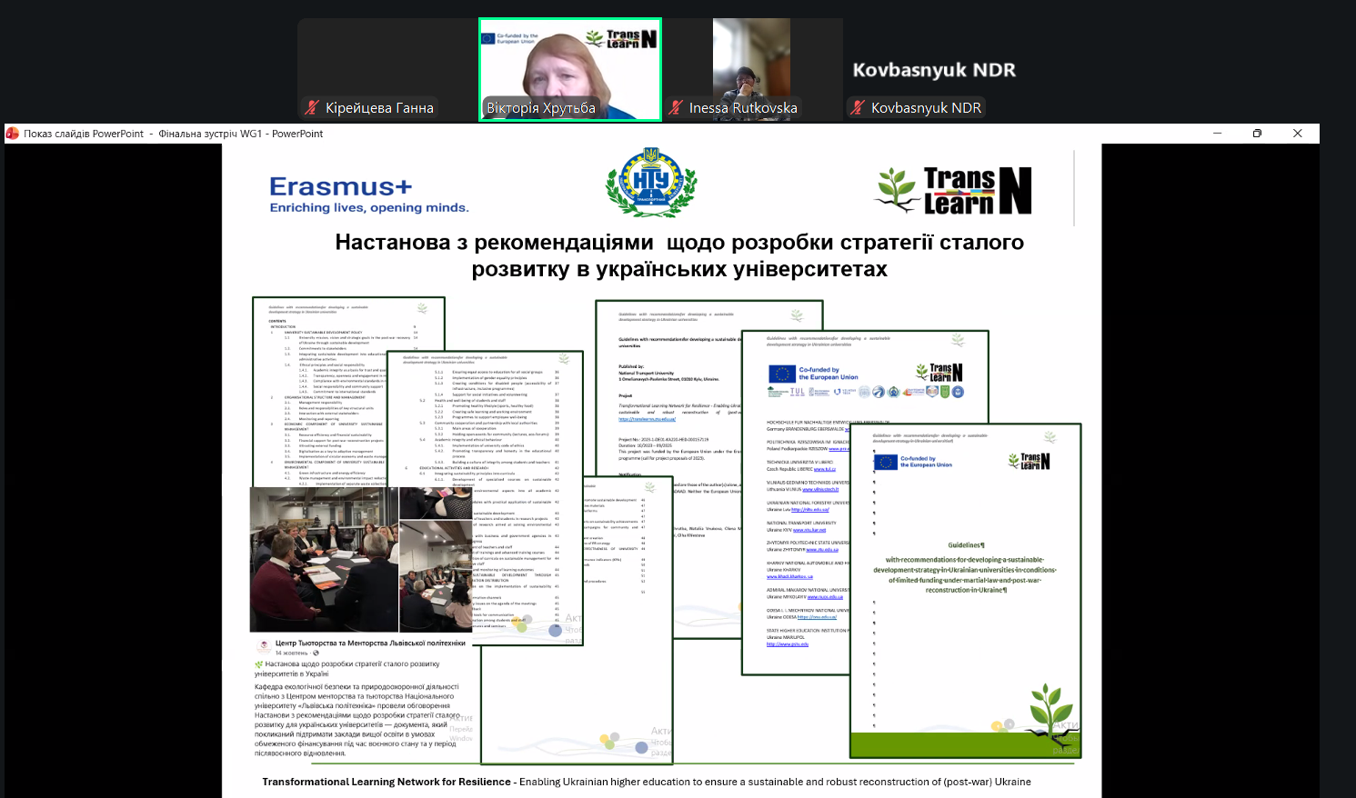 Фінальна зустріч Робочої групи 1 проєкту Transformational Learning Network for Resilience була присвячена підбиттю підсумків спільної діяльності з розробки підходів до впровадження сталого розвитку в університетах України. Учасники обговорили результати міжуніверситетської та міжнародної співпраці, позитивні практики, розвиток трансформаційної навчальної мережі, а також представили Настанову з рекомендаціями щодо формування стратегій сталого розвитку закладів вищої освіти. Зустріч окреслила подальші перспективи партнерства університетів, громад, бізнесу та органів місцевого самоврядування у відбудові та зміцненні вищої освіти України.