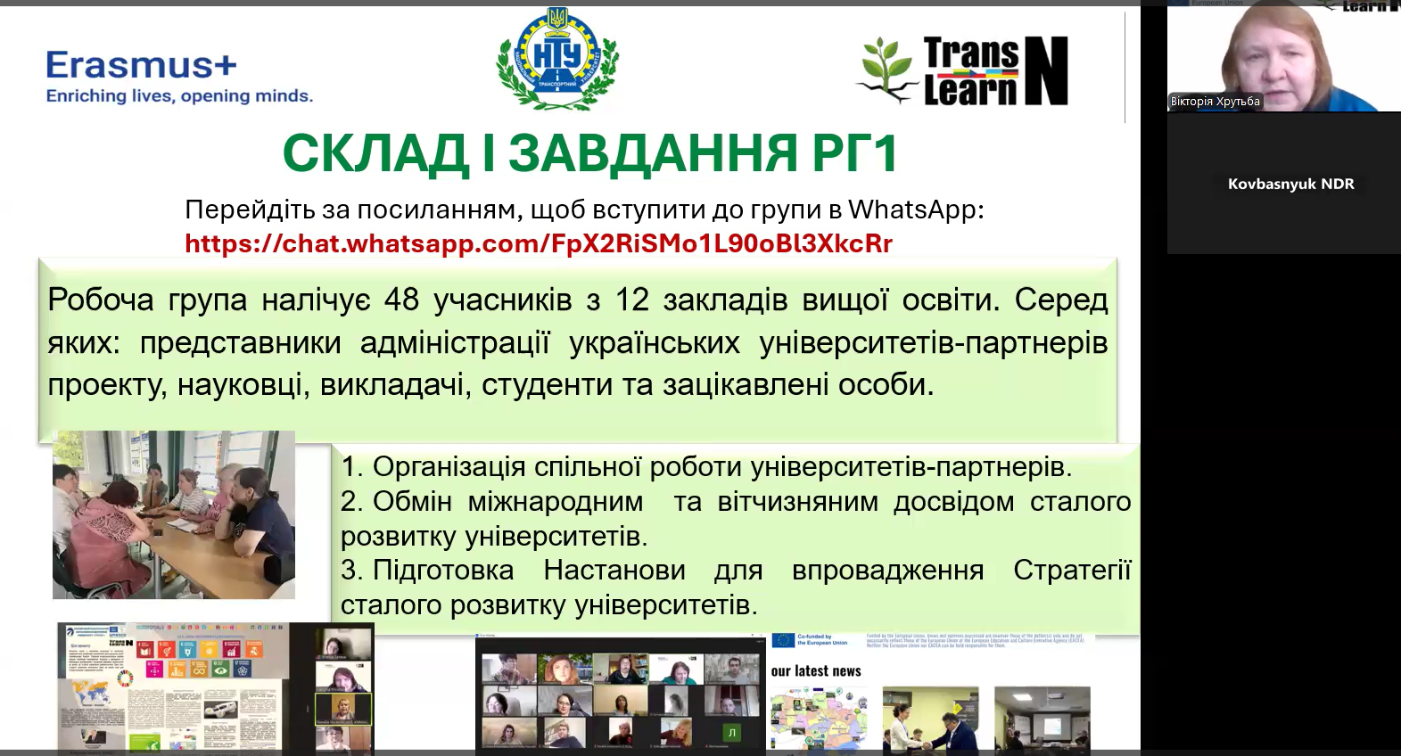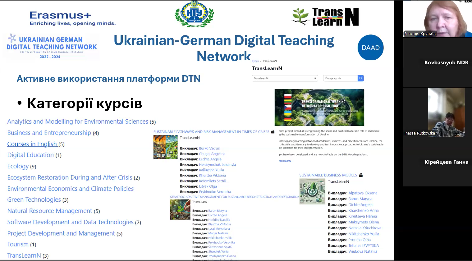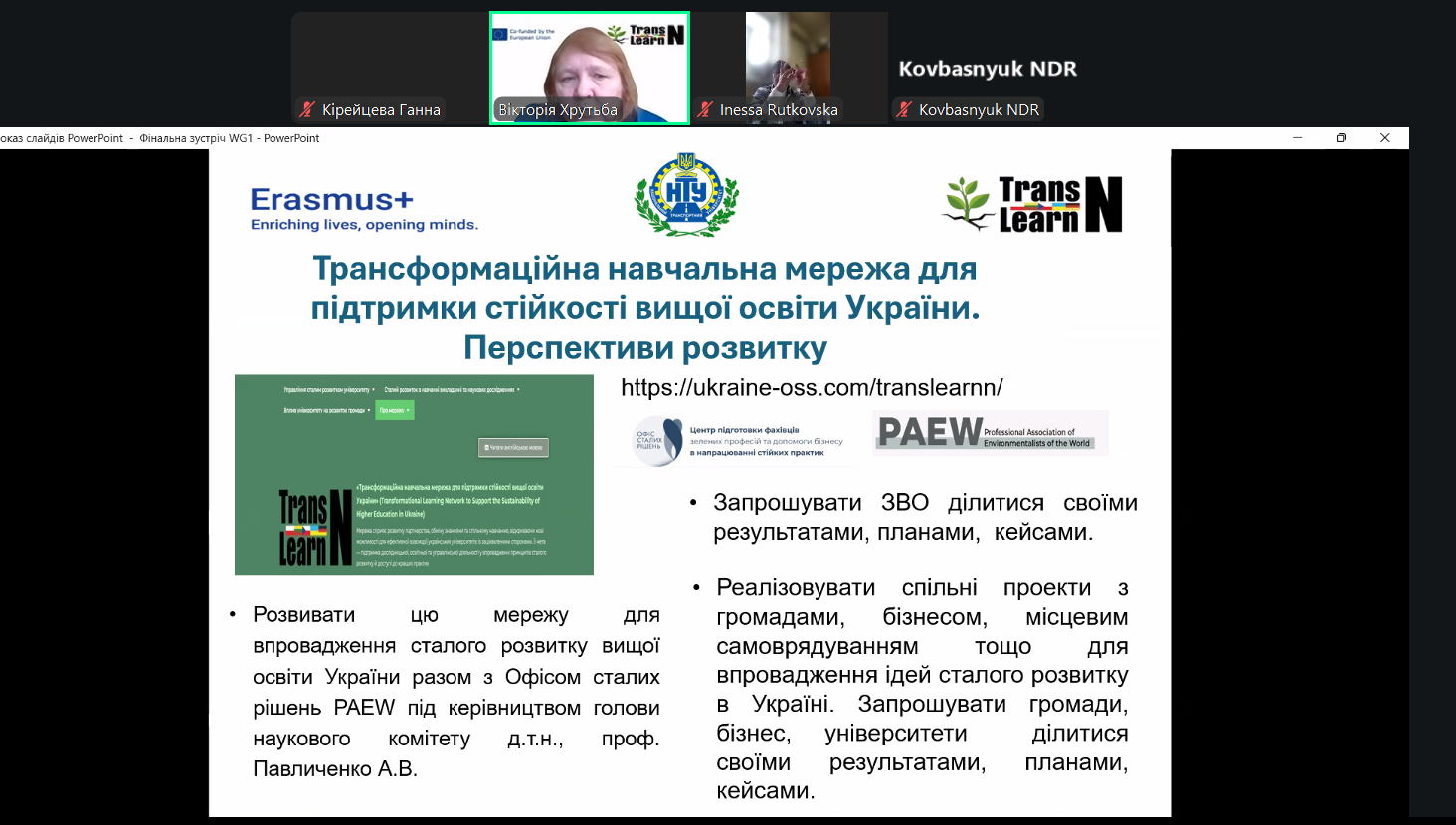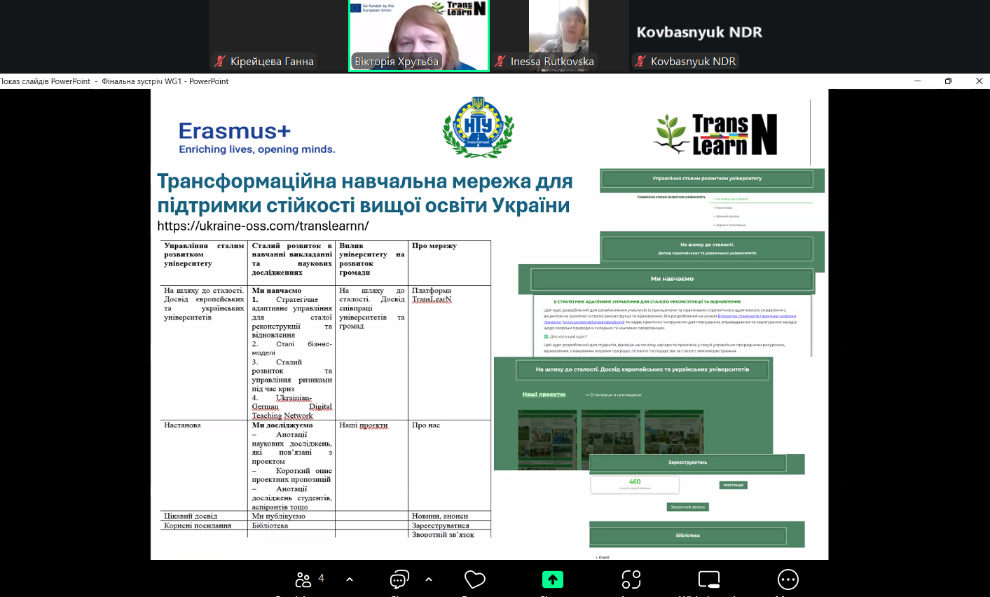 Фінальна зустріч Робочої групи 1 проєкту Transformational Learning Network for Resilience була присвячена підбиттю підсумків спільної діяльності з розробки підходів до впровадження сталого розвитку в університетах України. Учасники обговорили результати міжуніверситетської та міжнародної співпраці, позитивні практики, розвиток трансформаційної навчальної мережі, а також представили Настанову з рекомендаціями щодо формування стратегій сталого розвитку закладів вищої освіти. Зустріч окреслила подальші перспективи партнерства університетів, громад, бізнесу та органів місцевого самоврядування у відбудові та зміцненні вищої освіти України.